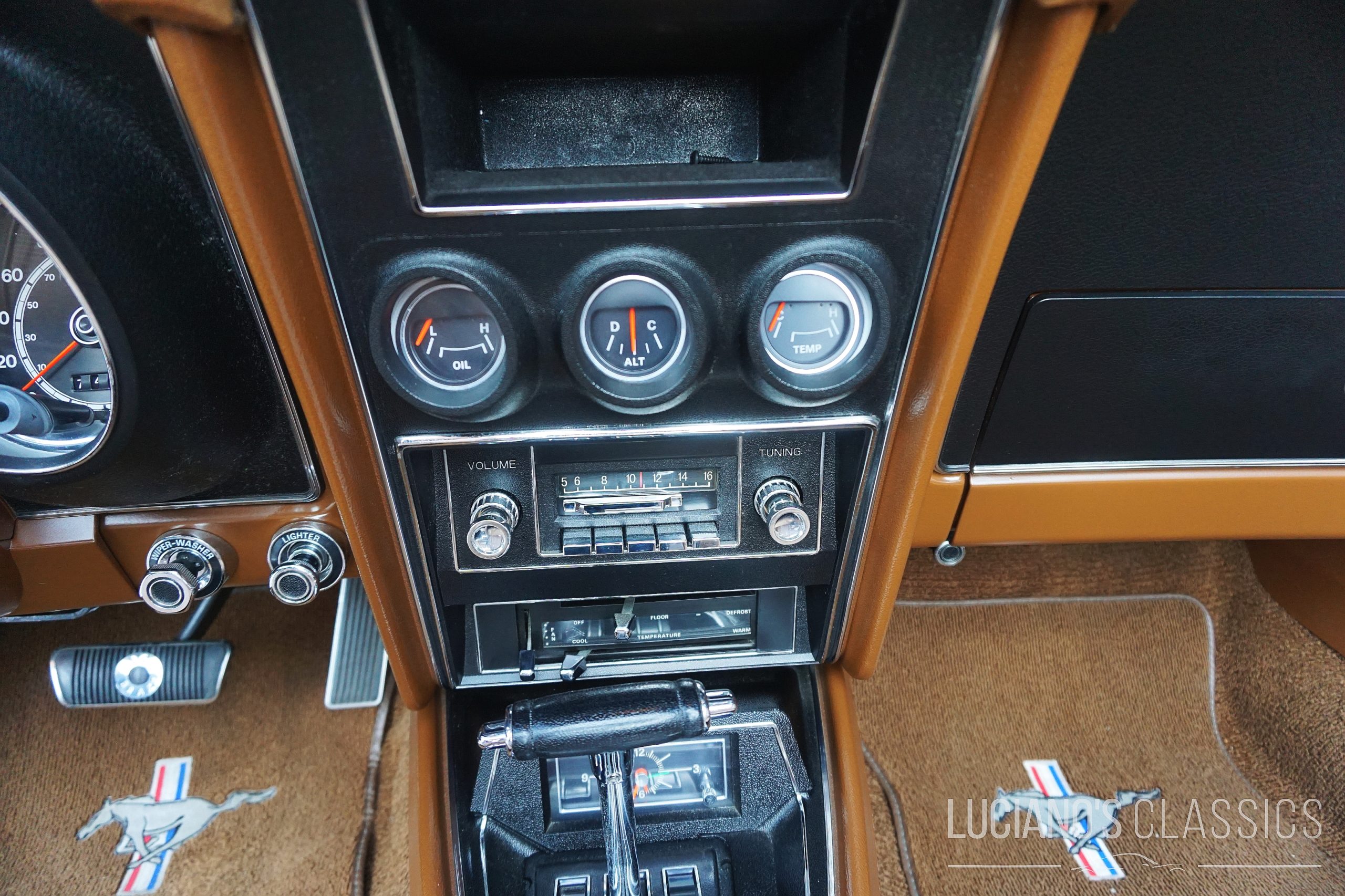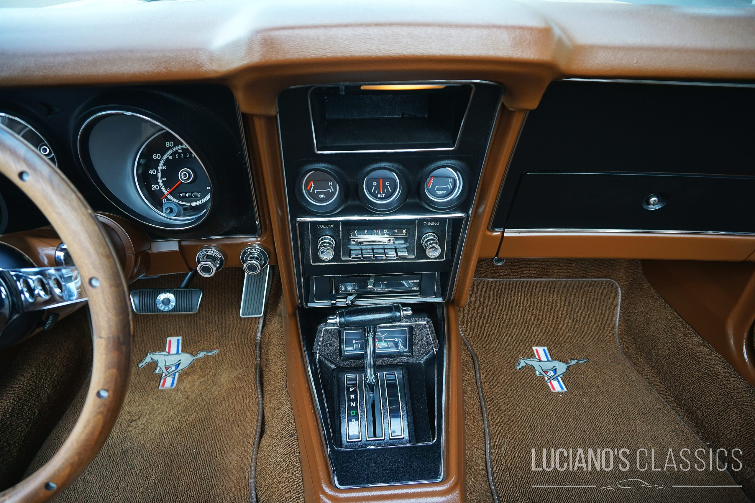 Dieses Mustang Cabrio in der seltenen Farbe Gold Glow ist ein echter Eyecatcher in einem top Zustand. Der Motor schnurrt wie am ersten Tag, das automatische Getriebe schaltet butterweich und auch die Bremsen haben keinerlei Alterserscheinungen. Dank der Lackierung, in der lediglich 377 Exemplare das Werk verlassen haben, erscheint der Wagen stehts anmutig und luxuriös – und so fährt er sich auch. Gemütlich und wohlwollend nimmt er Kurven wie Geraden gelassen und ohne zu meckern hin, bis man das Pedal durchdrückt und die Kapazitäten des Vierfachvergasers in Kombination mit dem 5.8 Liter grossen V8 voll ausreizt. Wird das Spasspedal durchgedrückt ist Feuer unter der Haube und Gummi auf dem Asphalt.